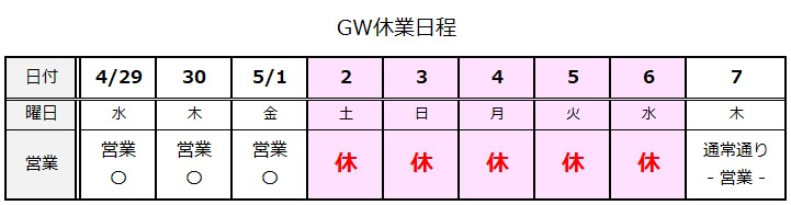 弊社ではゴールデンウィーク期間中、誠に勝手ながら下記日程を休業とさせて頂きます。